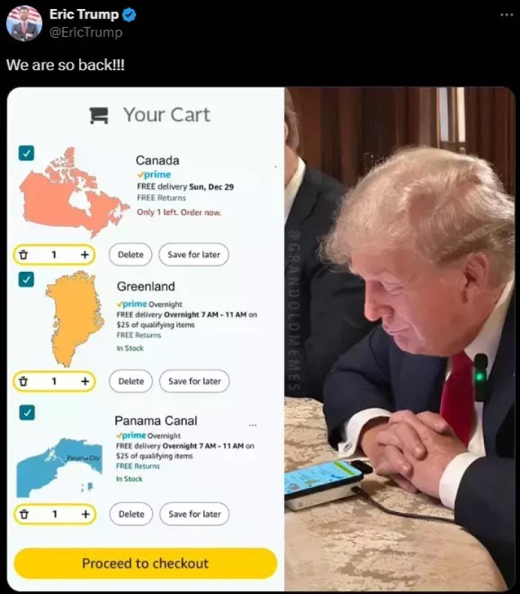 Eric'in X hesabındaki "Resmen geri döndük!" açıklamasıyla paylaştığı ve üzerinde oynanmış görselde, babasının Amazon'da alışveriş yaparken sepetine Kanada, Panama Kanalı ve Grönland'ı eklediği tasvir ediliyor. Trump'ın bu paylaşımı sosyal medyada bazı kullanıcıların da tepkisini çekti.