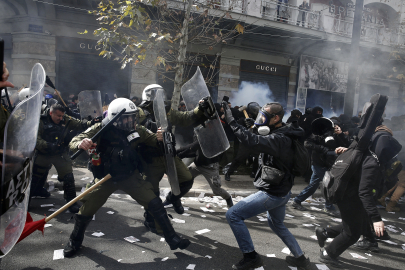 Barışçıl başlayan gösterilerde bir süre sonra arbede yaşandı. Yüzleri maskeli bir grup gösterici Sintagma Meydanı'ndaki parlamento binasının önünde konuşlanan çevik kuvvet birimine molotof kokteyli fırlattı. Polis göstericilere göz yaşartıcı gaz ile karşılık verdi. Çatışma kısa süre sonra diğer sokaklara yayıldı. Yerel saatle 13.30 itibarıyla çatışmalar nedeniyle bir çok protestocu, Sintagma Meydanı'ndan ayrıldı. Gösterilerde biber gazından etkilenen 3 kişinin hastaneye kaldırıldığı belirtildi. Göstericiler, bir süre sonra eylemlerini sürdürmek için parlamentonun bulunduğu meydana geri döndü.