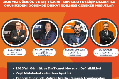 Asset Global Logistic Integration (GLI) ve NOSAB iş birliğiyle düzenlenen etkinlik, 15 Ocak Çarşamba günü, 13.30-16.30 saatleri arasında, NOSAB Yalçın Aras Konferans Salonu'nda gerçekleştirilecek. Konferansta, mevzuat değişikliklerinin yanı sıra yeşil mutabakat ve karbon ayak izi ile tedarik zincirinde maliyet azaltıcı gümrük uygulamaları masaya yatırılacak. Etkinlikte Asset GLI Mevzuat Direktörü Önal Yılmaz, Bursa Bölge Müdürü Burak Türkkan, İş Geliştirme Müdürü Hüseyin Dinsever ile Risk ve Yasal Uyum Koordinatörü Barış Çakır konuşmacı olarak yer alacak. Katılımcılar, güncel mevzuat değişiklikleri hakkında bilgi edinme fırsatı bulurken, dış ticaret ve lojistik süreçlerinde yeni stratejiler geliştirme imkanı yakalayacak.