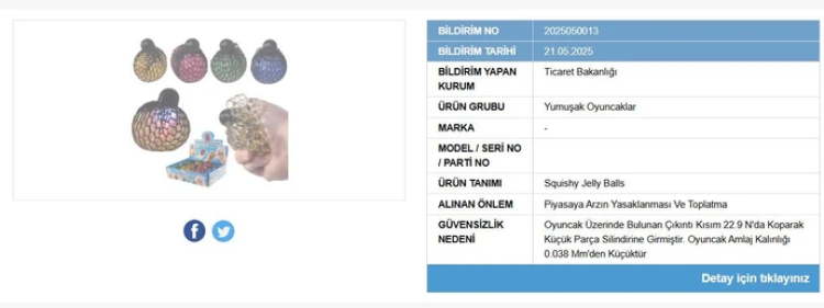 Ticaret Bakanlığı, Güvensiz Ürün Bilgi Sistemi üzerinden sağlık riski barındıran yeni ürünleri kamuoyuna açıklamaya devam ediyor. Bu kapsamda, çocuk sağlığını tehdit eden bir oyuncağın satışını yasakladı ve piyasadan toplatılmasına karar verdi.