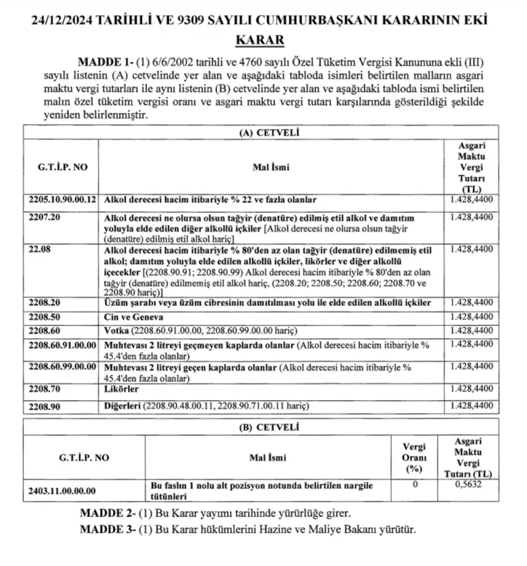 Yıl sonuna günler kala yeni bir zam haberi daha geldi. Alkollü içkilerde asgari maktu özel tüketim vergisi (ÖTV) tutarları yaklaşık yüzde 12,5 oranında artırıldı. Öte yandan nargile tütünlerindeki yüzde 63'lük vergi oranı sıfırlandı.