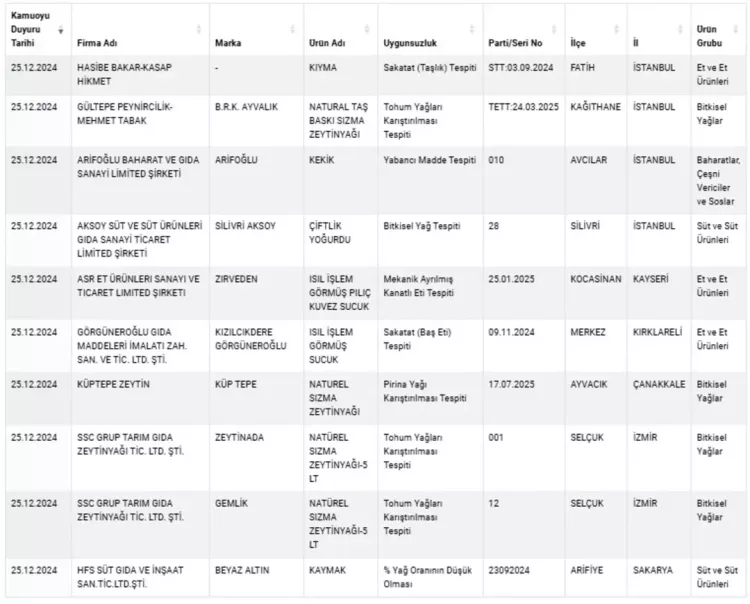 25 Aralık'ta güncellenen Taklit veya Tağşiş Yapılan Gıdalar listesinde kıyma, sucuk ve kekik yer aldı. İstanbul Fatih'te kıyma satışı yapan Hasibe Bakar-Kasap Hikmet firmasının ürününde sakatat tespit edildi.