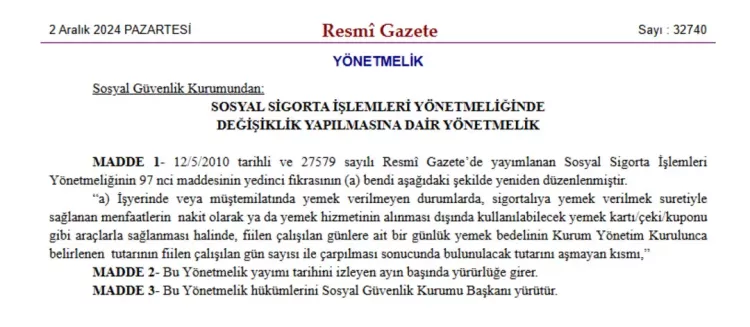İşyerinde veya müştemilatında yemek verilmeyen durumlarda yapılacak ödemeler ile ilgili değişikliğe gidildi. Resmi Gazete'de yayınlanan karara göre, yemek kartları ve çekleri kapsama alınırken, günlük hesaplamada asgari ücretin formülasyon şartı kaldırıldı.