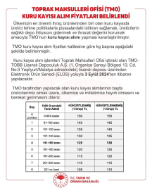 Bakanlıktan yapılan açıklamada, "Türkiye’nin en önemli ihraç ürünlerinden biri olan kuru kayısıda üretici lehine politikalarla piyasalardaki istikrarı sağlamak, üreticilerin sağlıklı depo ihtiyacını gidermek ve ihracat değerini korumak amacıyla TMO’nun kuru kayısı alımı yapması kararlaştırılmıştır. TMO kuru kayısı alım fiyatları kalitesine göre kg başına aşağıdaki şekilde belirlenmiştir. Kuru kayısı alım işlemleri Toprak Mahsulleri Ofisi iştiraki olan TMO-TOBB Lisanslı Depoculuk AŞ (1. Organize Sanayi Bölgesi 13. Cd. No: 3 Yeşilyurt/ Malatya adresindeki) lisanslı deposu üzerinden Elektronik Ürün Senedi (ELÜS) yoluyla 3 Eylül 2024’ten itibaren yapılacaktır" ifadelerine yer verildi.