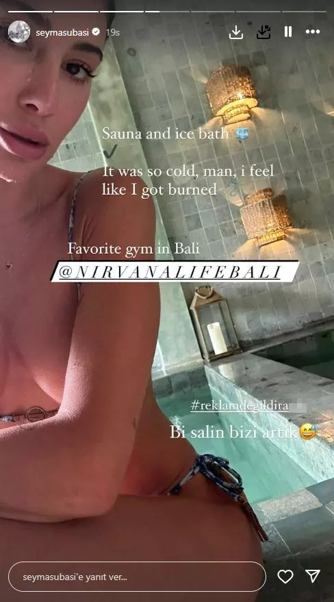 Şimdilerde Bali'de tatil yapan Şeyma Subaşı kaldığı otelin saunasında bikinili paylaşım yaptı.