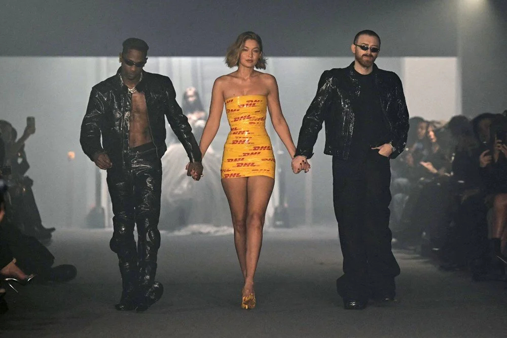 Rapçi Travis Scott'ın da boy gösterdiği defileye Gigi Hadid'in sarı elbisesi damga vurdu.