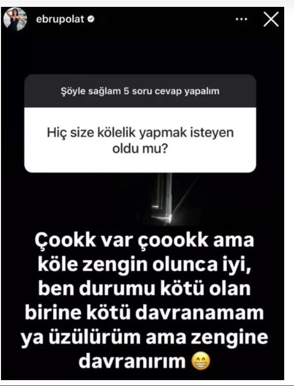 "HİÇ SİZE KÖLELİK YAPMAK İSTEYEN OLDU MU?" Geniş bir hayran kitlesi olan 41 yaşındaki Ebru Polat, bir takipçisinin "Hiç size kölelik yapmak isteyen oldu mu?" sorusunu yanıtsız bırakmadı.