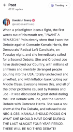 Cumhuriyetçi ABD Başkan Adayı Donald Trump, Demokrat rakibi Kamala Harris ile gerçekleştirdiği canlı yayın düellosuna ilişkin açıklamalarda bulundu. Kendisine ait sosyal medya platformu üzerinden bir mesaj yayınlayan Trump, daha önce “Marksist” olarak nitelediği Harris’i münazarada yendiğini belirterek, “Bir boksör dövüşü kaybettiğinde ağzından çıkan ilk sözcük ‘rövanş istiyorum’ olur. Anketler, salı gecesi Demokratların radikal sol adayı Kamala Harris yoldaşa karşı münazarayı açıkça kazandığımı gösteriyor. O da hemen ikinci münazara çağrısında bulundu” ifadelerini kullandı.
