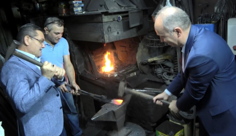 AK Partili Başkan Arslan, eline aldığı çekiç ile CHP’li Başkan Akyol ise balyoz ile örs üzerinde demiri dövdü. Ardından ise Bartın Belediye Başkanı Muhammet Rıza Yalçınkaya ise Bartın Esnaf ve Sanatkarlar Odaları Birliği Başkanı Yılmaz Akdeniz ile birlikte demir dövmek için örsün başına geçti. Bu arada Akdeniz, elindeki Balyoz’u Belediye Başkanı Yalçınkaya’ya vermek istedi. Demir ustaları ise çekicin ustaların elinde olduğunu, balyozun ise çırakların kullandığını belirtti. Bunun üzerine Başkan Yalçınkaya, çekici kendi alırken, balyozu ise Akdeniz’e verdi. Demir ustaları, başkanların demir dövmesini beğendiğini ifade ederek, iş yeri sahibine her iki başkanı da işe almalarını istedi. Yaşanan usta-çırak muhabbeti ve yapılan espriler gülüşmelere neden oldu.