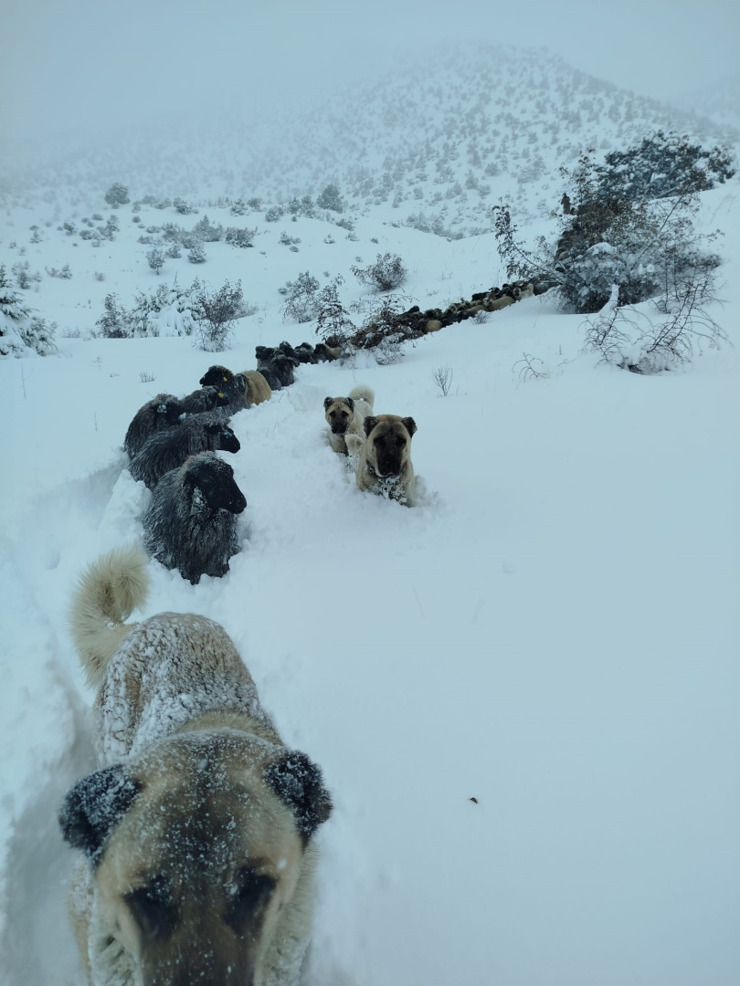 Artvin'in Yusufeli ilçesine bağlı Darıca Köyü Arike mezrasında, aniden bastıran kar yağışı sonrası 250 küçükbaş hayvanıyla mahsur kalan Dursun Cansız, sürüsünü köye indirmek zorunda kaldı.