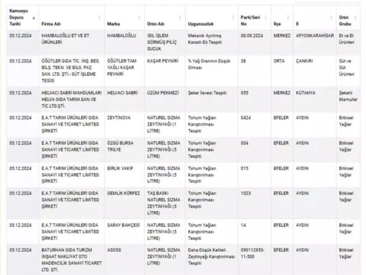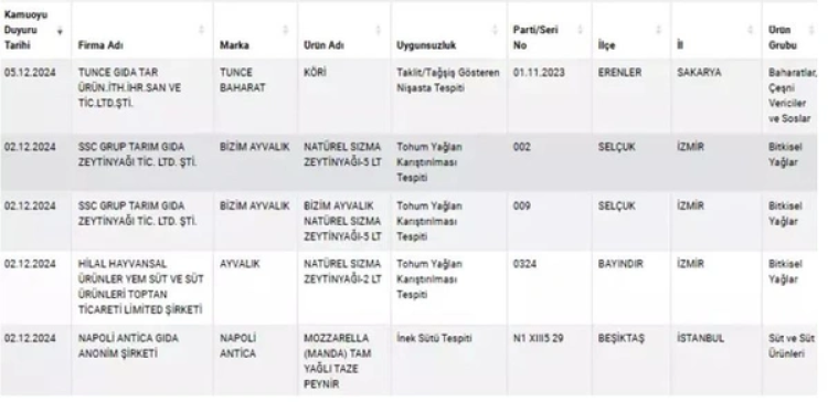 Listeye yeni eklenen ürünlerde, zeytinyağında tohum yağlarının karıştırılması, kaşar peynirinde yağ oranının düşük olması, üzüm pekmezindetaklit ve tağşiş yapıldığı tespit edilirken, köri baharatında nişasta maddesi tespiti gibi çeşitli uygunsuzluklar belirlendi.