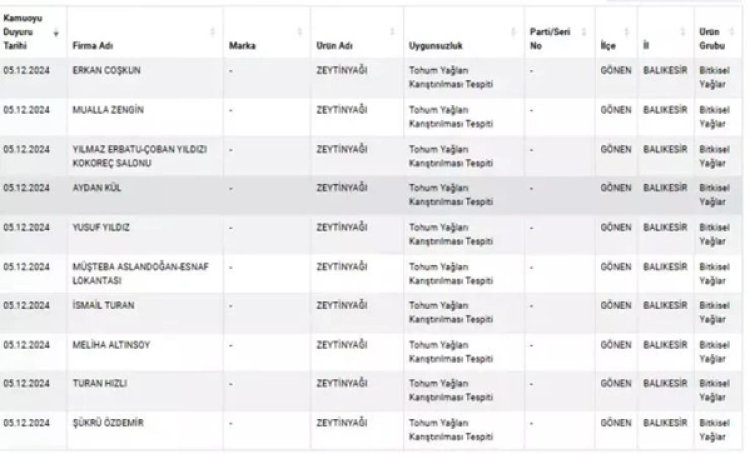 Zeytinyağında bulunmaması gereken ürünlerde tohum yağları yer alması ile bazı ürünlerde kanatlı eti ve sakatat tespiti gibi birçok uygunsuzluk listede yer aldı.