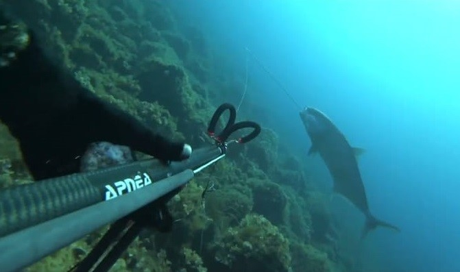 Çanakkale’de tüpsüz olarak, zıpkın ile 18 metre derinlikte serbest dalış yapan rekortmen dalgıç Müjdat Turan, 64 kilogram ağırlığında, 1 metre 80 metre santim boyunda akya balığı avladı.