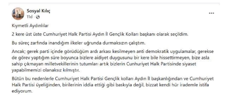 CHP İl Gençlik Kolları Başkanı Sosyal Kılıç, sosyal medyadan yaptığı açıklamada iki dönem üst üste CHP Aydın İl Gençlik Kolları Başkanı olarak seçildiğini hatırlatarak, "Bu süreç zarfında inandığım ilkeler uğrunda durmaksızın çalıştım. Ancak gerek parti içinde gördüğüm ardı arkası kesilmeyen anti demokratik uygulamalar, gerekse de görev yaptığım süre boyunca bizlere aidiyet duygusunu bir kere bile hissettirmeyen, bize asla sahip çıkmayan milletvekillerinin tutumları, artık bizlerin Cumhuriyet Halk Partisi'nde siyaset yapabilmemizi imkansız kılmıştır" ifadelerini kullandı.