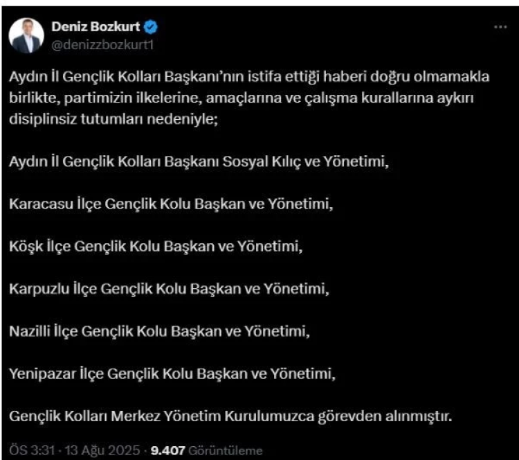 "Aydın İl Gençlik Kolları Başkanı’nın istifa ettiği haberi doğru olmamakla birlikte, partimizin ilkelerine, amaçlarına ve çalışma kurallarına aykırı disiplinsiz tutumları nedeniyle; Aydın İl Gençlik Kolları Başkanı Sosyal Kılıç ve Yönetimi, Karacasu İlçe Gençlik Kolu Başkan ve Yönetimi, Köşk İlçe Gençlik Kolu Başkan ve Yönetimi, Karpuzlu İlçe Gençlik Kolu Başkan ve Yönetimi, Nazilli İlçe Gençlik Kolu Başkan ve Yönetimi, Yenipazar İlçe Gençlik Kolu Başkan ve Yönetimi, Gençlik Kolları Merkez Yönetim Kurulumuzca görevden alınmıştır."