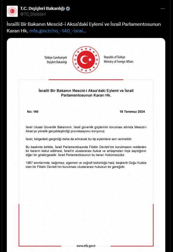 Dışişleri Bakanlığı sosyal medya hesabı üzerinden açıklama yaparak İsrailli bakanın Mescid-i Aksa’daki provokasyonunu kınadı.