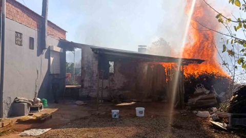 Evinin etrafını saran alevlere gözyaşları içinde hortumla müdahale etti