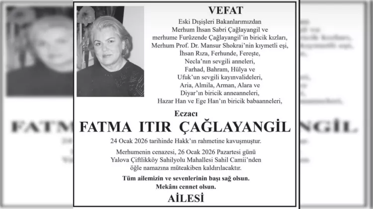 Fatma Itır Çağlayangil’in cenazesi, bugün Yalova’nın Çiftlikköy ilçesinde bulunan Sahilyolu Mahallesi’ndeki Sahil Camii’nde, öğle namazını müteakip kılınacak cenaze namazının ardından toprağa verilecek.