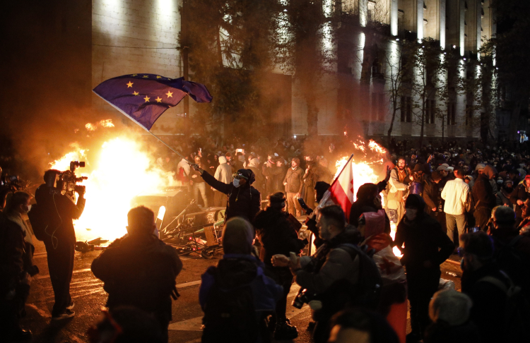 Gürcistan'da Başbakan İrakli Kobakhidze hükümetinin AB'ye katılım müzakerelerini 2028 yılına kadar gündeme getirmeyeceklerine yönelik kararı, halkı sokağa döktü. Başkent Tiflis'te AB ve Gürcistan bayrakları taşıyan binlerce protestocu parlamento binası önünde toplanarak, "Yaşasın Gürcistan", "Köleler", "Ruslar", "Git, git" şeklinde sloganlar attı. Polis protestoculara dağılmaları yönünde uyarıda bulundu. Protestocuların parlamentoya girmeye çalışması üzerine polis, tazyikli su ve göz yaşartıcı gaz kullandı. Bazı protestocular polise havai fişek attı. Çıkan olaylarda onlarca kişi yaralandı. Yerel saatle 21.00'de başlayan protesto, çatışmaya dönüşerek sabah saatlerine kadar devam etti. Gürcistan İçişleri Bakanlığından protestoya ilişkin açıklamada, 43 protestocunun gözaltına alındığı, 32 polisin yaralandığı bildirildi.