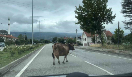 Bolu-Karacasu kara yolunda Gölcük Tabiat Parkı’na gitmek isteyen vatandaşların gidiş güzergahında inekler trafiği tehlikeye düşürdü. Orta refüjde otlayan ineklerden biri, yolun ortasına geçti. İki şeritli yol üzerinde araçlara aldırış etmeden giden büyükbaş hayvan trafiği tehlikeye düşürdü. O anlar kameraya yansıdı.