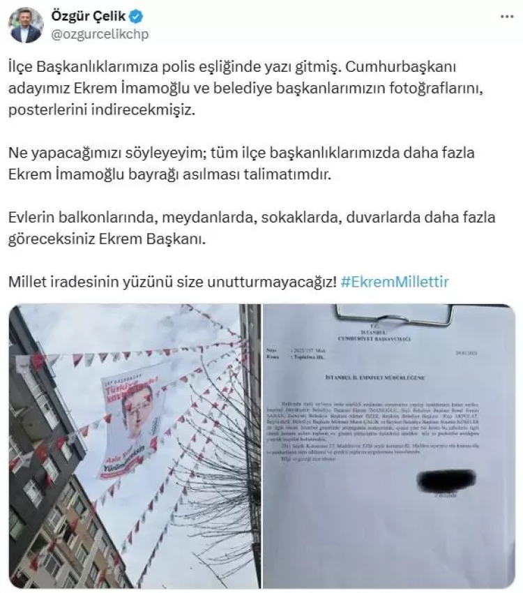Sosyal medya hesabı X üzerinden resmi belgeyi paylaşarak duruma tepki gösteren CHP İstanbul İl Başkanı Özgür Çelik, "İlçe Başkanlıklarımıza polis eşliğinde yazı gitmiş. Cumhurbaşkanı adayımız Ekrem İmamoğlu ve belediye başkanlarımızın fotoğraflarını, posterlerini indirecekmişiz. Ne yapacağımızı söyleyeyim; tüm ilçe başkanlıklarımızda daha fazla Ekrem İmamoğlu bayrağı asılması talimatımdır. Evlerin balkonlarında, meydanlarda, sokaklarda, duvarlarda daha fazla göreceksiniz Ekrem Başkanı. Millet iradesinin yüzünü size unutturmayacağız" dedi.