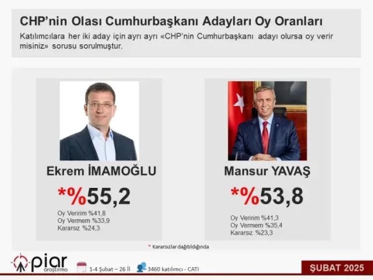 Piar Araştırma tarafından 1-4 Şubat'ta 26 ilde 3 bin 460 kişiyle gerçekleştirilen ankette katılımcılara Ekrem İmamoğlu ve Mansur Yavaş için ayrı ayrı "CHP'nin cumhurbaşkanı adayı olsa oy verir misiniz?" diye soruldu. Ankette, kararsızlar dağıtıldığında İmamoğlu için oy veririm diyenlerin oranı yüzde 55.2, tercihini Yavaş'tan kana kullananların oranı ise yüzde 53.8 oldu.
