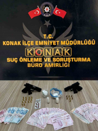 Konak İlçe Emniyet Müdürlüğü Suç Önleme ve Soruşturma Büro Amirliği ekipleri, uyuşturucu ticareti yapıldığının belirlenmesi üzerine 2 şüpheliyi takibe aldı. Ekipler tarafından şüphelilerin kullandığı motosikletin, özel bölümüne zulalanmış halde 2 ruhsatsız tabanca, 109 gram metamfetamin ve uyuşturucu ticaretinden elde edildiği değerlendirilen 26 bin 380 bira nakit para ele geçirildi.
