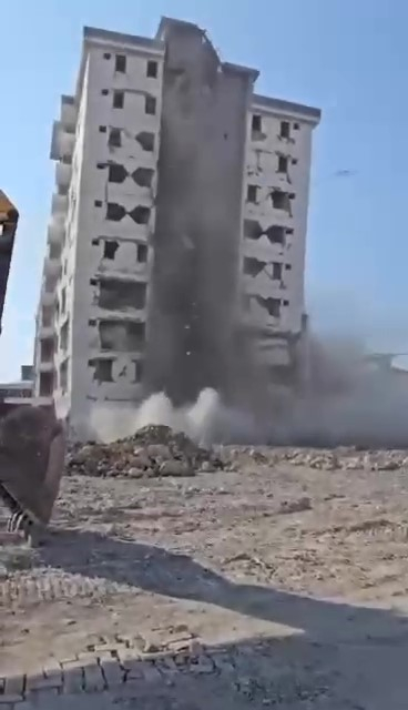 Kahramanmaraş merkezli depremlerde ağır hasar alan Hatay'da mahkeme süreci sona eren binaların yıkım ve enkaz kaldırma çalışmaları aralıksız sürüyor. İskenderun ilçesi Numune Mahallesi Dr. Sadık Ahmet Caddesinde bulunan 10 katlı apartman da iş makinesiyle kontrollü olarak yıkıldı. Binanın yerle bir olma anıysa kameralara yansıdı. 10 katlı binanın yıkımı esnasında herhangi bir olumsuzluk yaşanmadı. Problemsiz olarak gerçekleşen yıkılma anları ise saniye saniye cep telefonu kamerasına yansıdı.