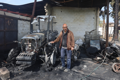 Hatay’da alevlere teslim olan garajdaki 1 traktör, 3 motosiklet ve tarım aletleri kullanılmaz hale geldi. Yangın anında yaşananları anlatan Galip Güney, traktörün tekerinin patlamasıyla yangını fark ettiklerini söyledi.