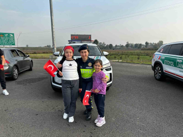 Cumhuriyet’in 101. yıl dönümü Sakarya’da çeşitli etkinlikler ile kutlandı. Sakarya İl Jandarma Komutanlığı’na bağlı Otoyol Jandarma ekipleri 29 Ekim Cumhuriyet Bayramı coşkusunu otoyollara da taşıdı. Ekipler, otoyolda seyahat eden vatandaşlara çikolata ve bayrak hediye etti. Seyahat esnasında otoyolda durdurularak hediyelerini alan çocukların mutlulukları ise adeta gözlerinden okundu.