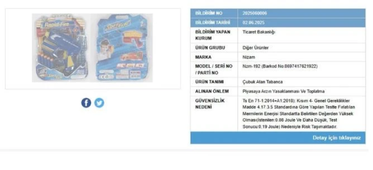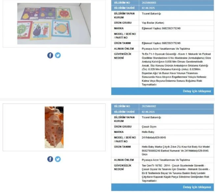 Ticaret Bakanlığı, Güvensiz Ürün Bilgi Sistemi’nde (GÜBİS) çocuk giyimi, oyuncak ve temizlik malzemeleri kategorisindeki bazı ürünler hakkında toplatılma kararı verildi.