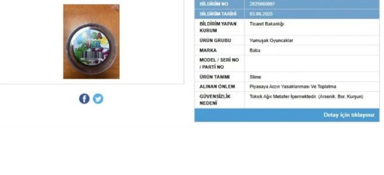 Bakanlığı yayımladığı ürünlerde Baba marka yumuşak oyuncağın (slime) toksik ağır metaller içerdiği ve piyasadan toplatılma kararı verdiği görüldü.