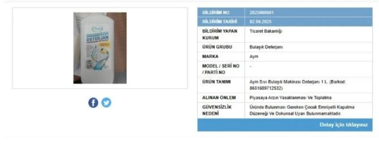 AYM marka bulaşık deterjanının da çocuk emniyet kapama düzeneği ve dokunsal uyarı bulunmamasından dolayı piyasada arzı yasaklandı.