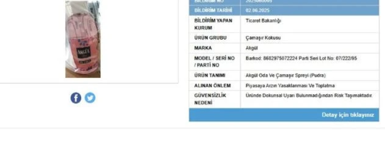 Akgül marka oda ve çamaşır spreyinde de üründe dokunsal uyarı bulunmadığından risk taşıdığı belirlendi ve toplatılma kararı verildi.