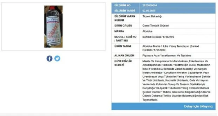 Temizlik ürünü olarak kullanılan Alcoblue marka yüzey temizleyicisinin ambalajında gerekli uyarıların karşılanmadığı tespit edildi.