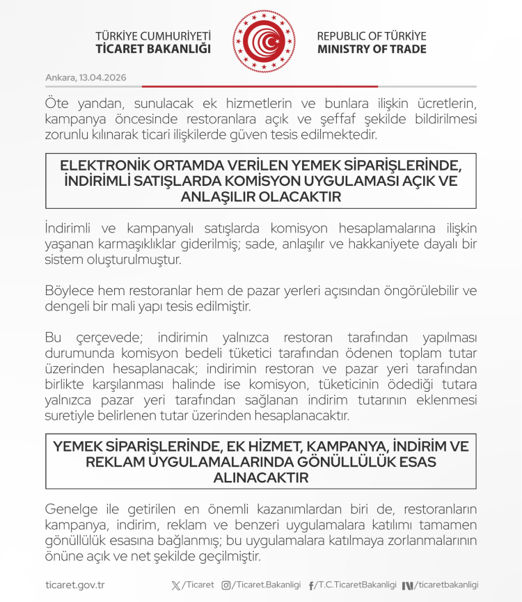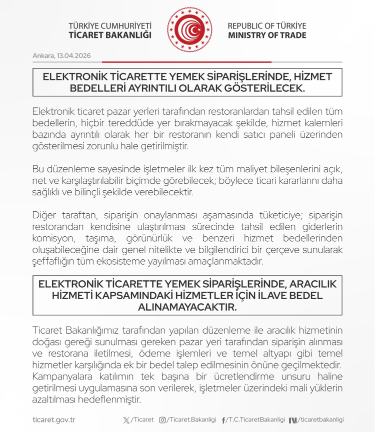 Ticaret Bakanlığı'nın hayata geçirdiği yeni düzenleme ile, yemek sipariş platformlarının, restoranlardan tahsil ettiği tüm hizmet bedelleri şeffaf hale getirildi, zorunlu ek ücret uygulamalarına son verildi ve kampanya süreçlerinde gönüllülük esası getirildi.