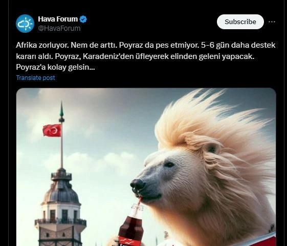 "Afrika zorluyor. Nem de arttı. Poyraz da pes etmiyor. 5-6 gün daha destek kararı aldı. Poyraz, Karadeniz'den üfleyerek elinden geleni yapacak. Poyraz'a kolay gelsin..."