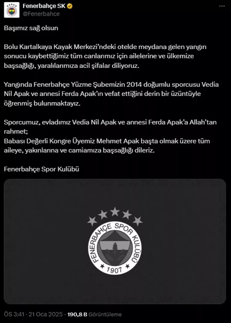 Başımız sağ olsun Bolu Kartalkaya Kayak Merkezi’ndeki otelde meydana gelen yangın sonucu kaybettiğimiz tüm canlarımız için ailelerine ve ülkemize başsağlığı, yaralılarımıza acil şifalar diliyoruz. Yangında Fenerbahçe Yüzme Şubemizin 2014 doğumlu sporcusu Vedia Nil Apak ve annesi Ferda Apak’ın vefat ettiğini derin bir üzüntüyle öğrenmiş bulunmaktayız. Sporcumuz, evladımız Vedia Nil Apak ve annesi Ferda Apak’a Allah’tan rahmet; Babası Değerli Kongre Üyemiz Mehmet Apak başta olmak üzere tüm aileye, yakınlarına ve camiamıza başsağlığı dileriz.
