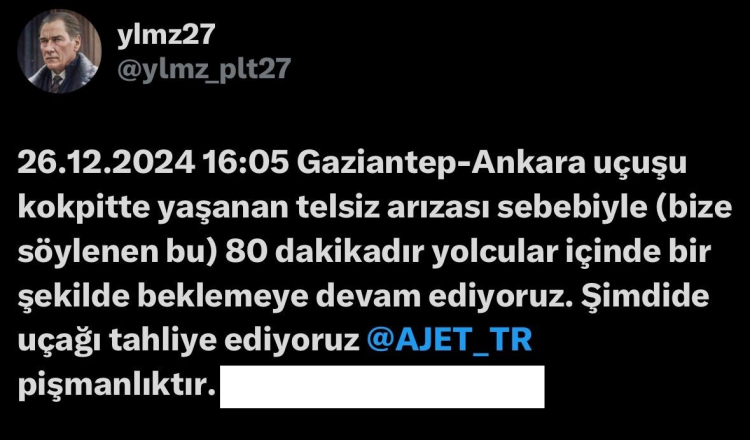 İddiaya göre, dün saat 16.05'te Gaziantep'ten Ankara'ya gitmek için Ajet'ten bilet alan vatandaşlar, SunExpress uçağına bindirildi. Ancak uçakta, kulaklık sisteminde meydana gelen arıza nedeniyle yolcular iki saat boyunca bekletildi. Arızanın giderilememesi üzerine yolcular uçaktan indirildi.