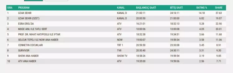 23 Şubat Pazartesi akşamı televizyon ekranları yine büyük bir rekabete sahne oldu. Total, AB ve ABC1 kategorilerinde “Uzak Şehir” hem yeni bölümü hem de özet bölümüyle izleyiciyi ekrana kilitleyerek zirvedeki yerini korudu. Güçlü hikâyesi ve sadık izleyici kitlesi sayesinde dizi, tüm kategorilerde ilk iki sıradaki konumunu muhafaza etti.