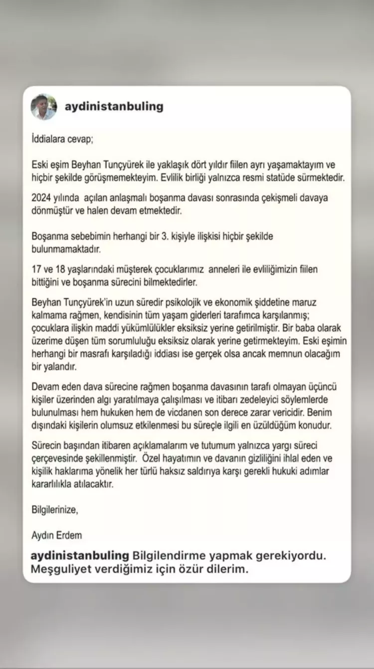 İş insanı Aydın Erdem, eşi Beyhan Tunçyürek tarafından kendisine yöneltilen Dolunay Soysert iddialarını sosyal medyadan yalanladı. Erdem, dört yıldır ayrı yaşadıklarını, psikolojik ve ekonomik şiddete maruz kaldığını ve çocuklarının bakımını eksiksiz karşıladığını ifade etti.