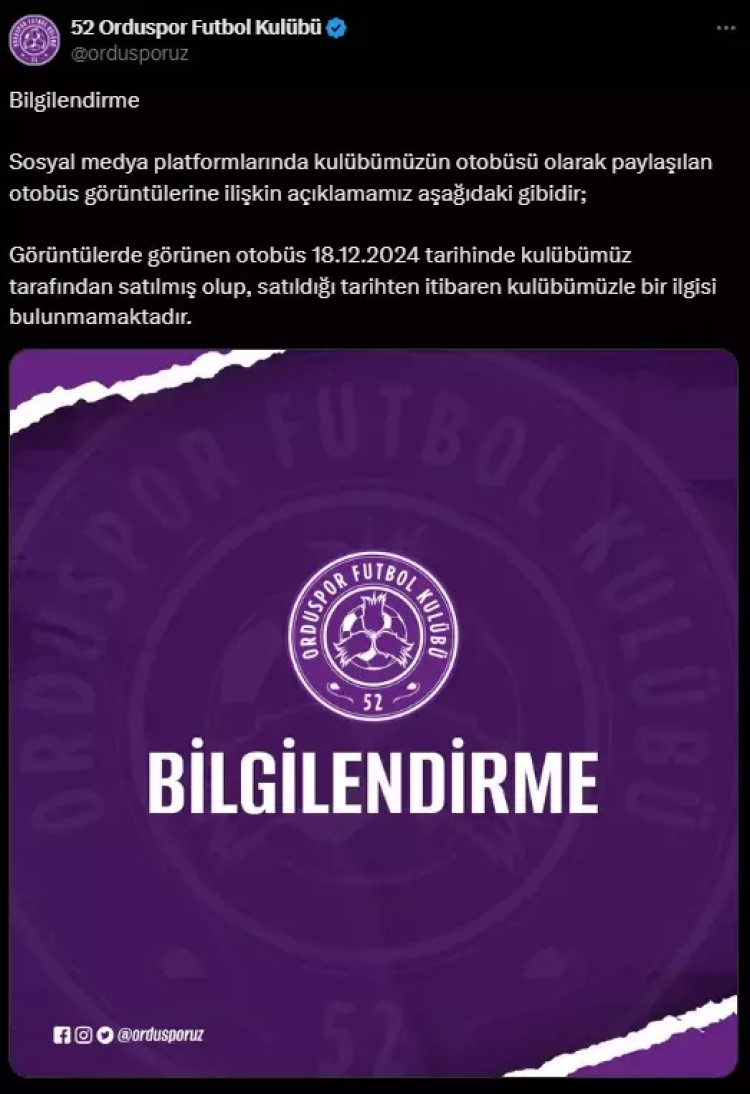 Sosyal medyada Orduspor FK takım otobüsünün Suriye’de görüldüğüne dair paylaşılan görüntülere ilişkin kulüpten yapılan açıklamada, söz konusu otobüsün 2 hafta önce satıldığı belirtildi.