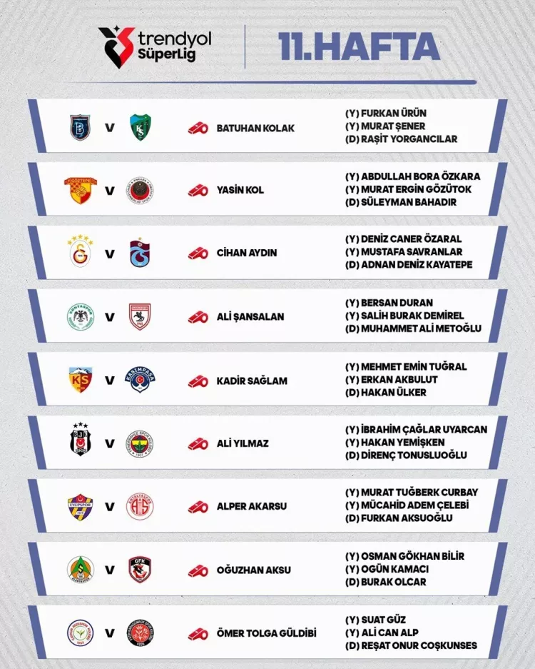 Türkiye Futbol Federasyonu Merkez Hakem Kurulunun açıklamasına göre ligde 11. hafta maçlarında görev yapacak hakemler şunlar: