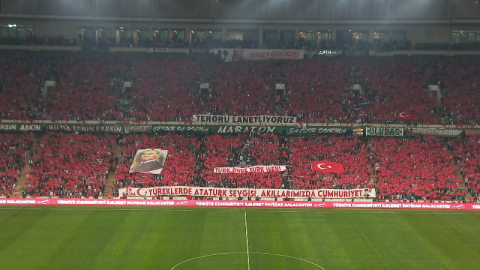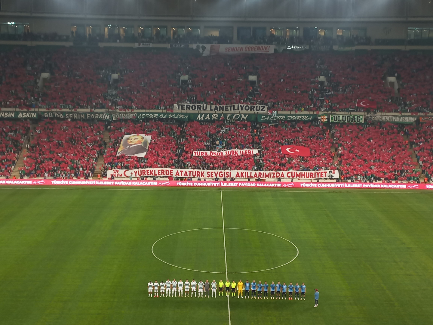 Bursaspor tribünleri, karşılaşmada ilk düdüğe kadar çalan marşlara da eşlik etti. Taraftarlar teröre de lanet okudu.