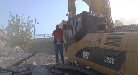 Kahramanmaraş merkezli depremlerden etkilenen 11 ilden biri olan Malatya’da ağır hasarlı binaların yıkım işlemleri sürüyor. Battalgazi ilçesi Kernek Mahallesi’nde yıkım işlemleri gerçekleştirilen bir evin duvarında fark edilen Türk bayrağı üzerine yıkım durduruldu. Duvarda bayrağı fark eden iş makinesi operatörü bayrağı bulunduğu yerden alarak arkadaşlarına teslim ettikten sonra yıkım işlemlerine devam etti.