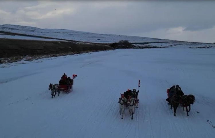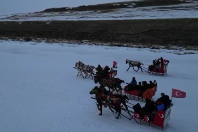 Dondurucu soğuk nedeniyle yüzeyi tamamen buzla kaplanan Çıldır Gölü'ne gelen turistler atlı kızakla geziyor.