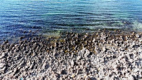 Türkiye'nin tek sodalı gölü olma özelliğini taşıyan Van Gölü'nde, son yıllarda sularının çekilmesiyle sahiller mikrobiyalit tarlasına döndü.