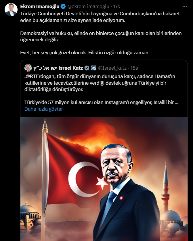 İmamoğlu oysa kendinden beklenileni değil tam aksi yönde hastalıklı ruh hali içindeki israilli bakana öyle güzel cevap verdi ki, tokat gibi yapıştırdı: