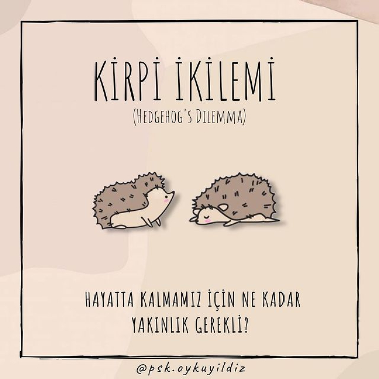 Alman filozof A. Schopenhauer insan ilişkileri hakkında geliştirdiği ” kirpi metaformu ” buna güzel bir örnektir. Soğuk havalarda üşüyen bir kirpinin biraz ısınmak için diğer kirpilere yaklaşmaya çalıştığı gözlemlenir. Fakat her denemesinde hem kendi hem de diğerlerinin dikenleri ona acı verir ve uzaklaşmak zorunda kalır. Yine de soğuk onu geri iter ve böylece ısınma ihtiyacı ile acıdan kaçma arzusu arasında sürekli gidip gelir. Bu ikilemin sonunda kirpi bir çözüm bulur; güvenli bir mesafeyi bulup korumak ! Ne çok yakın olup acı çekmek ne de çok uzak olup donmaktır bu mesefa. Başka bir tabirle ne izole eden dondurucu bir yalnızlık, ne de bizi boğacak kadar bir yakınlık. Bütün mesele insan ilişkilerinde bu hassas dengeyi bulup korumaktır.